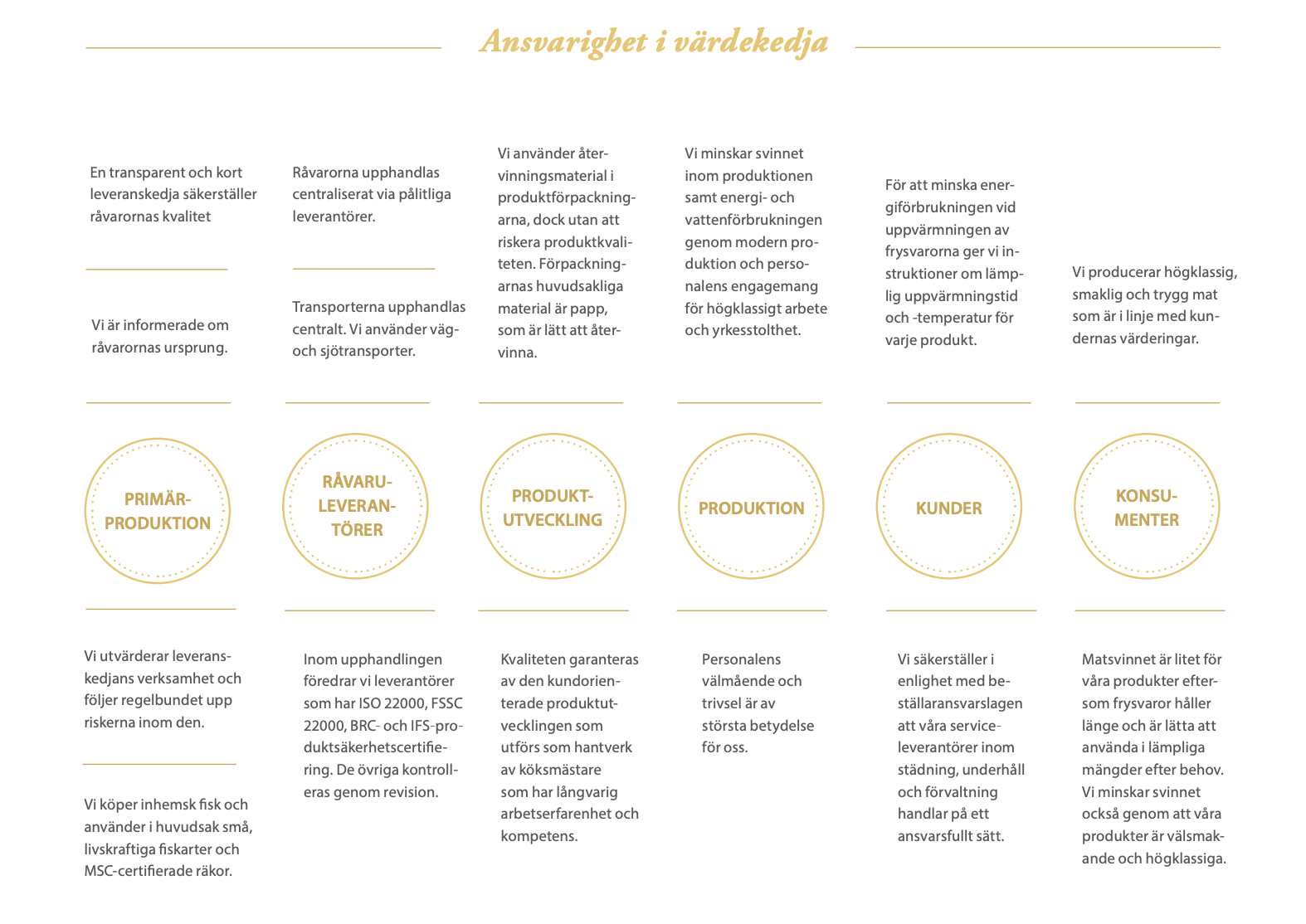 Lagerblad Foods indelar effekterna och målen för sitt företagsansvar under tre teman:ansvaret inom affärsverksamheten, ansvaret i fråga om produkterna och åtgärder för att minska vår klimatpåverkan. Målet är att vi fortlöpande förbättrar nivån på vårt ansvarsarbete.